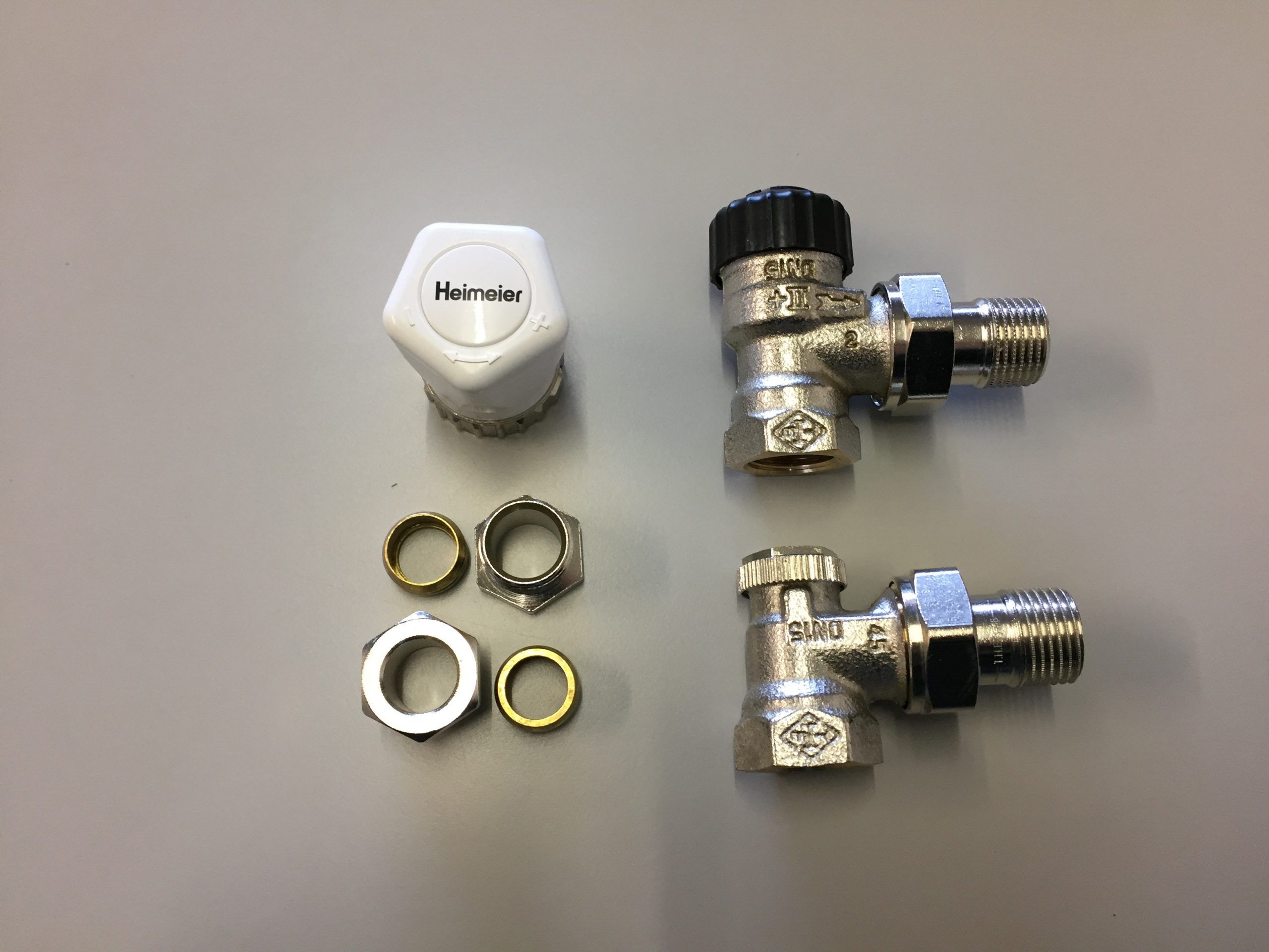 Aansluitset 47 (Haakse CV kraan, haaks voetventiel, handwiel, + knelset 15mm aansluiting) t.b.v. Thermrad S4/S8, Compact S6, en alle radiatoren met ½” aansluiting.