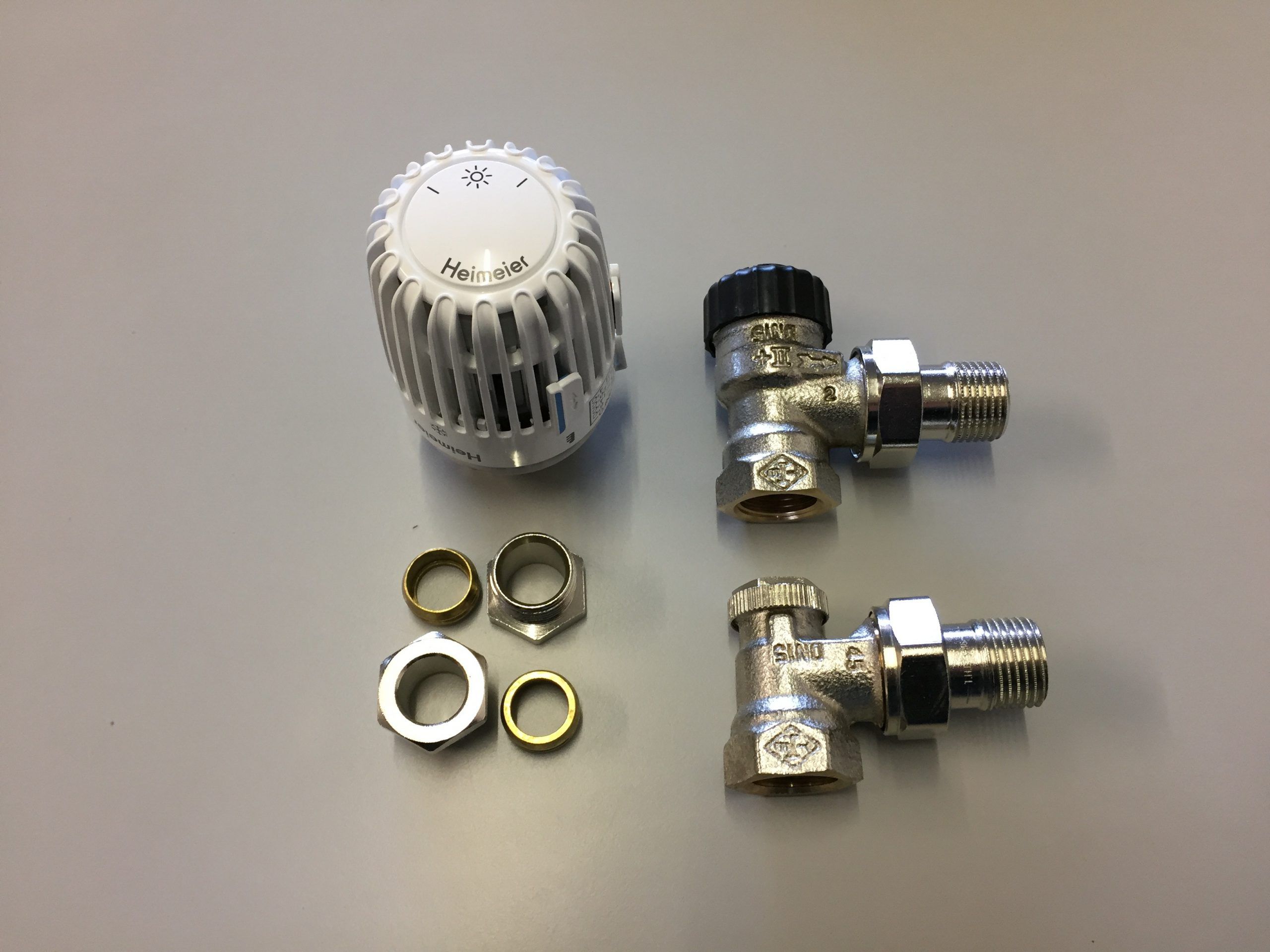 Aansluitset 48 (Haakse thermostaat kraan, haaks voetventiel, therm. knop + knelset 15mm aansluiting) t.b.v. Thermrad S4/S8, Compact S6, en alle radiatoren met ½” aansluiting.