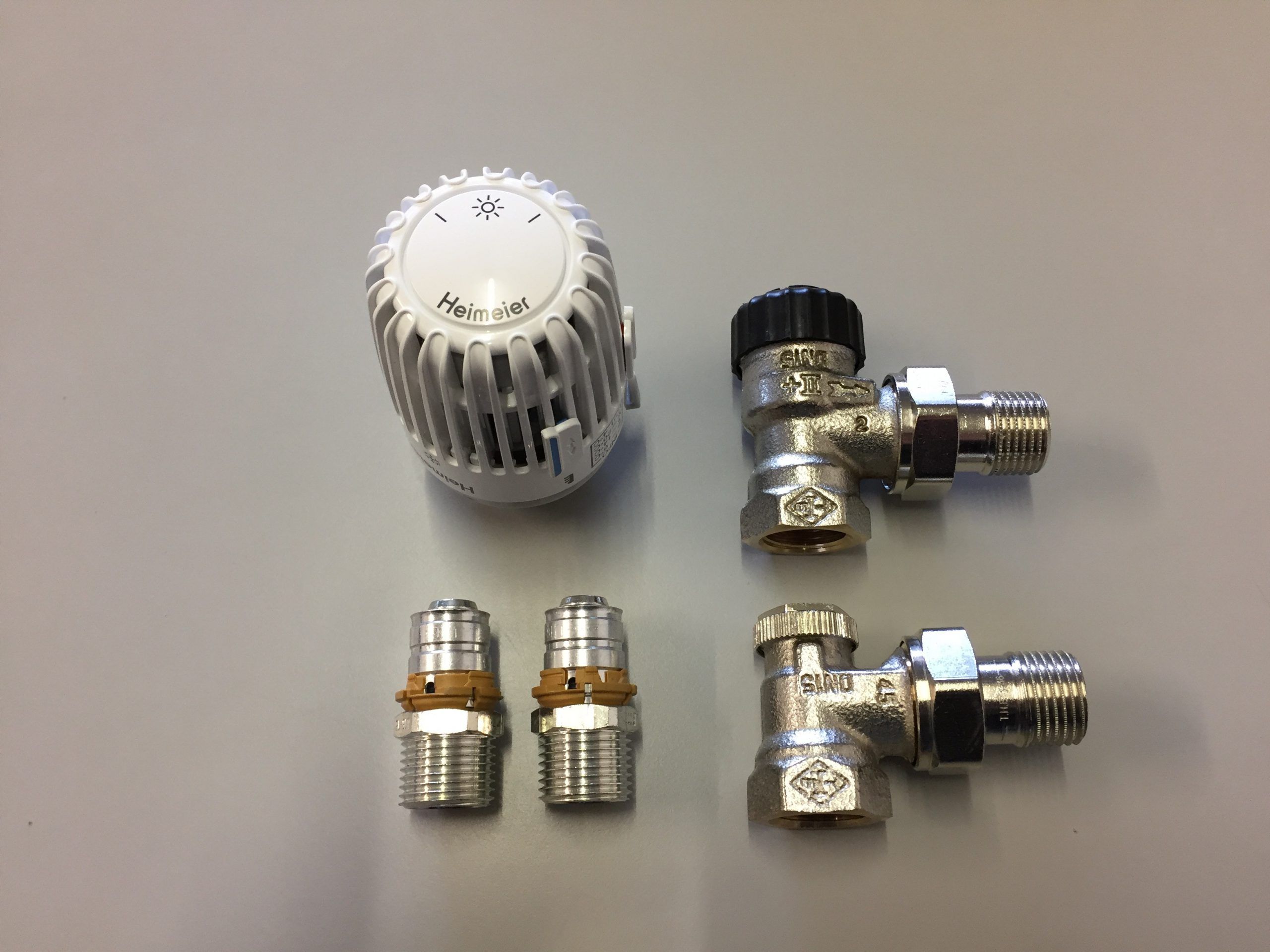 Aansluitset 62 (Haakse thermostaat kraan, haaks voetventiel, therm. knop + pers verloop 16×1/2” aansluiting) t.b.v. Thermrad S4/S8, Compact S6, en alle radiatoren met ½” aansluiting.