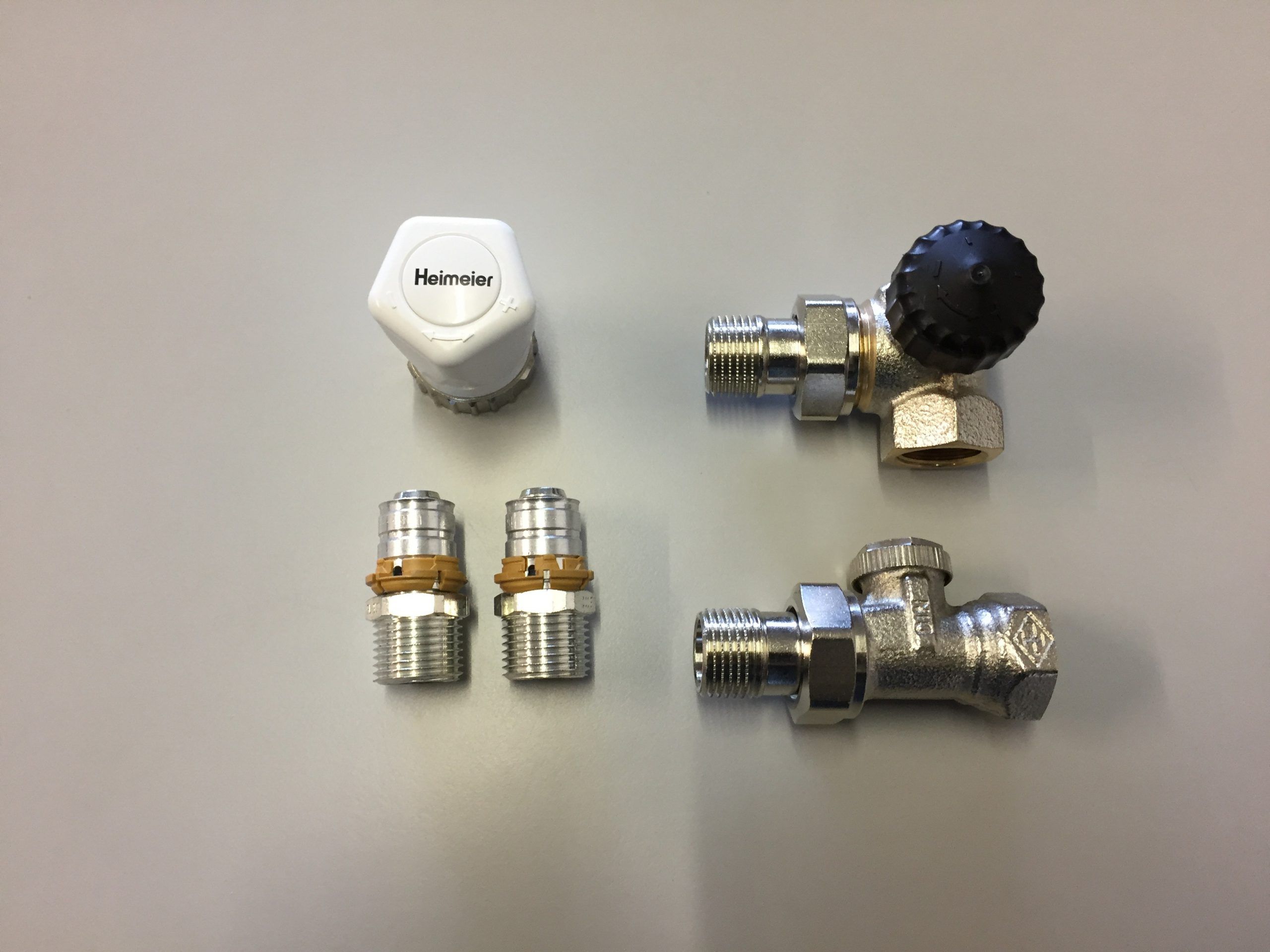 Aansluitset 65 ( Dubbel haaks verkeerd rechts CV kraan, recht voetventiel, handwiel, + pers verloop 16×1/2” aansluiting) t.b.v. Thermrad S4/S8, Compact S6, en alle radiatoren met ½” aansluiting.