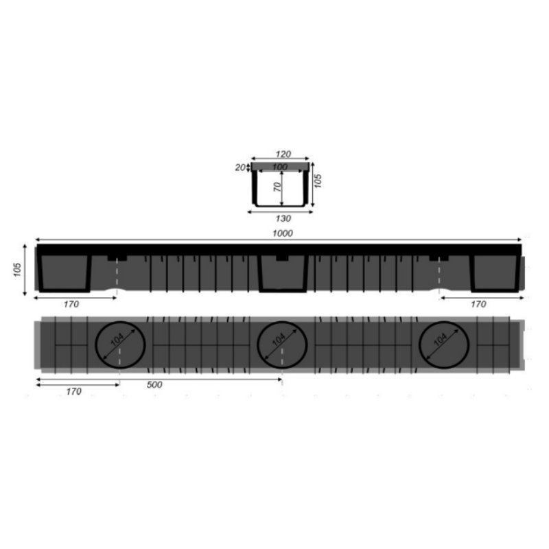 Afvoergoot met gegalvaniseerd rooster 1000 mm lang x 130 mm breed x 105 mm hoog. Artikelnummer: 0072.