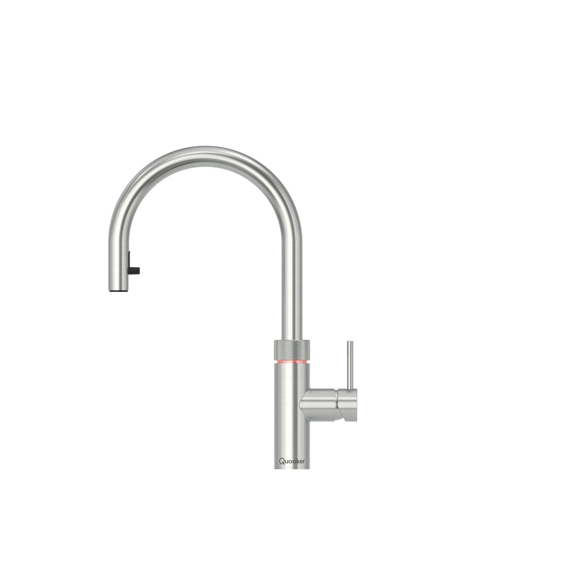 De Flex is de enige Quooker-kraan met een handige, flexibele uittrekslang. Naast warm, koud en kokend water kan de Flex ook koel bruisend en gefilterd water geven, als je hem combineert met de Quooker CUBE. Dankzij de kokendwaterstop kan de Flex geen kokend water geven als de slang uitgetrokken is.