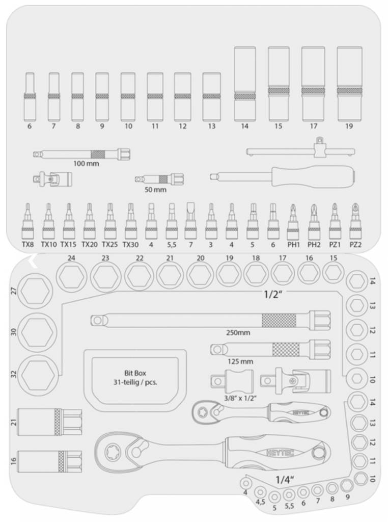 Beschrijving HEYTEC Dopsleutelset 1/4+1/2 – 105-Delig 50825-5015