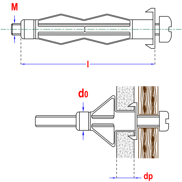 | – Hollewandplug uit verzinkt staal met metrische schroefdraad, verkrijgbaar met diverse schroeven. |